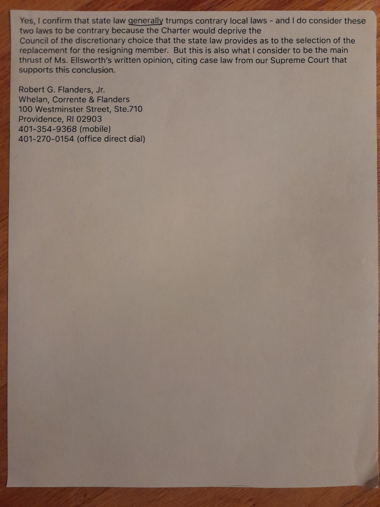 I was handed two new legal memos by other councilors during the meeting. Unlike the other legal memos by the Solicitor and SC Attorney, I did not have an opportunity to review these prior to the meeting. I did first notice Atty Flander’s short paragraph stated “state law generally trumps contrary local laws”.