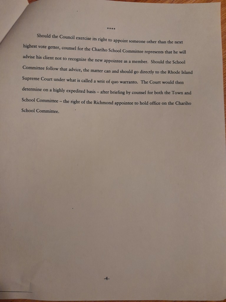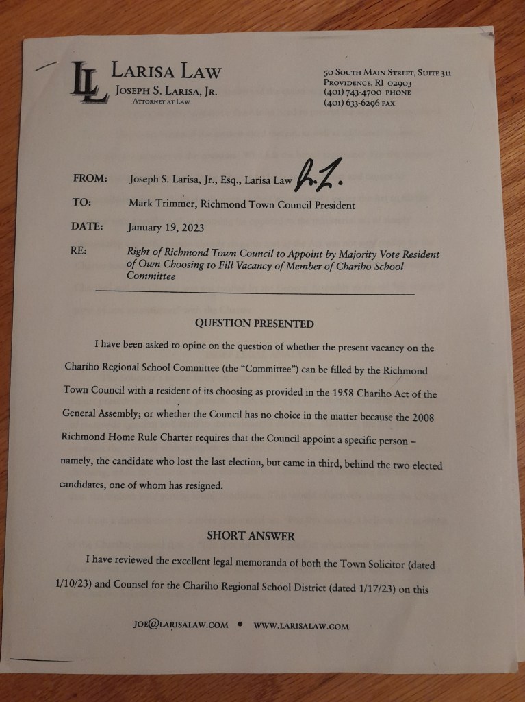 During discussions, President Trimmer stated this is a Chariho issue so we should follow the Chariho Act. I reminded him we are the Richmond Town Council. Accordingly, we should follow the Charter.