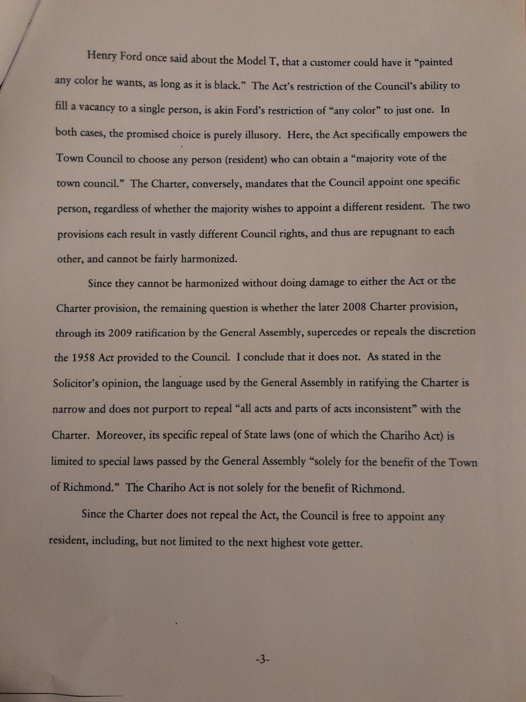 I take my oath to office seriously which stated in part that, “I do solemnly swear… …that I will observe the Charter and the ordinances of the Town of Richmond, and that I will faithfully discharge the duties of my office.”